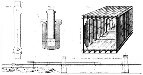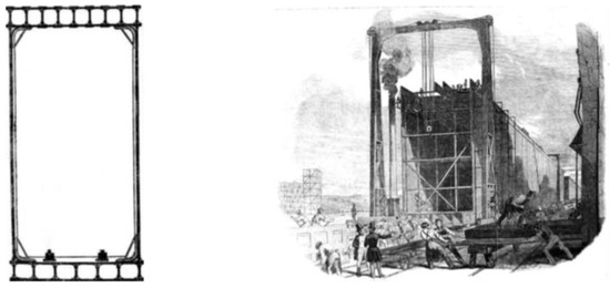 - The Bridge-Tunnel or Air Tunnel over the Menai Strait. Detail of the Screwed and Gusseted Drawer Structure. Source: "Revue Générale de L’architecture et des Travaux Publics", France, 1849: Volume 8, (Pl.22). p. Available online: https://portaildocumentaire.citedelarchitecture.fr/pdfjs/web/viewer.html?file=/Infodoc/ged/viewPortalPublished.ashx?eid%3DIFD_FICJOINT_FRAPN02_RA_1849_04_PDF_1 (accessed on 23 March 2022).