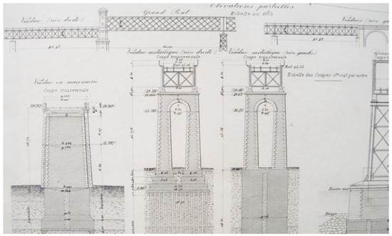 Cubzac Bridge, Pilaster structure detail and general elevation, designed by Eiffel. Source: Taken from the Annales des Ponts et Chaussées Gravées by Macquet illustrating the notice on the construction of the Cubzac bridges over the Dordogne. the École des Ponts Paris Tech, an associated center in civil engineering of the National Library of France, provides access to the full text of the Annales des ponts et chaussées (period 1831–1931), through the Gallica digital library.