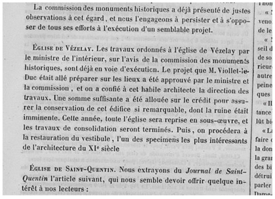 - Extract from the Article “Historic Monuments”. Source: “Revue Générale de L’architecture et des Travaux Publics”, France, 1840: Vol.4, col.241. p. Available online: https://portaildocumentaire.citedelarchitecture.fr/pdfjs/web/viewer.html?file=/Infodoc/ged/viewPortalPublished.ashx?eid%3DIFD_FICJOINT_FRAPN02_RA_1840_04_PDF_1 (accessed on 23 March 2022).