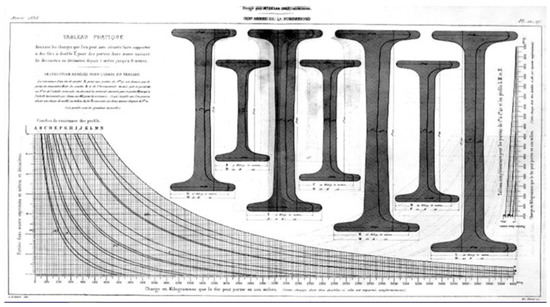 - Barré, L. Table-Strength Record of Double T profiles. Source: “Revue Générale de l’architecture et des Travaux Publics”, France, 1858: Vol.2, (Pl.12-22), p. Available online: https://portaildocumentaire.citedelarchitecture.fr/pdfjs/web/viewer.html?file=/Infodoc/ged/viewPortalPublished.ashx?eid%3DIFD_FICJOINT_FRAPN02_RA_1858_1802_PDF_1851 (accessed on 23 March 2022).