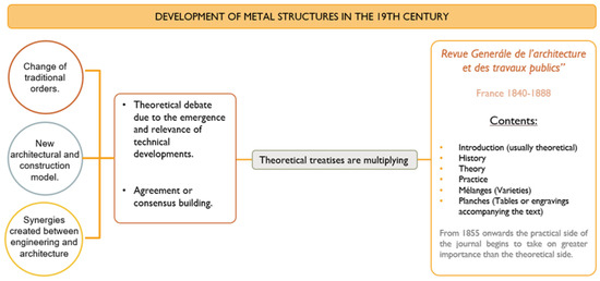 In the 19th century, the theory of applying the technological advances obtained so far to architecture began to emerge in France. The first scientific journals appeared, which revolutionised the dissemination of different theories and greatly facilitated their diffusion and application, spreading to different countries, such as Britain.