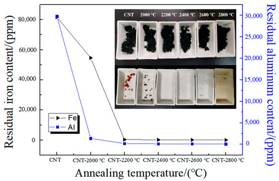 The ICP of MWNTs annealed at different temperatures for 180 min is shown in Figure 1. As the annealing temperature increases, the metal impurities in MWNTs gradually decrease. It is worth noting that the content of iron impurities drops sharply at 2200 °C, with a smaller drop in the content of iron and aluminum impurities after 2200 °C. The inset in Figure 1 shows the amount of metal catalyst remaining in the MWNTs at different annealing temperatures after empty firing at 800 °C, where the metal catalyst is no longer visible in the porcelain boat at CNT-2200 °C, while some catalyst remains at CNT-2000 °C, which is consistent with the ICP data. As can be seen more specifically in Table 1, the content of metal impurities drops below 200 ppm at temperatures up to 2400 °C and below 100 ppm for both Fe and Al when temperatures reach 2800 °C. This suggests that high temperature annealing can achieve the effective removal of metal impurities from MWNTs.