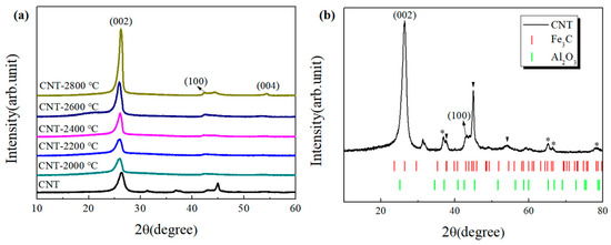The XRD of MWNTs annealed for 180 min at different temperatures is shown in Figure 2a. The 002 peak does not change significantly for the CNT-2000 °C and CNT-2200 °C samples, while for the CNT-2400 °C sample, the 002 peak gradually increases, and as the temperature continues to rise, the 002 peak gradually increases and becomes sharper. The 002 peak is highest for the CNT-2800 °C sample, and the characteristic peaks of carbon nanotubes 100 and 004 are also more pronounced at 2800 °C [29]. The result indicates that the MWNTs are more graphitized and highly ordered at higher temperatures. It is clear from Figure 2b that the CNT contains other impurity peaks, which were calibrated by PDF card, and it can be confirmed that the prepared MWNTs contain metal impurities, composing mostly iron carbide and alumina, which have been calibrated in the figure. In addition, a splitting of the 100 peak in the CNT was found, which was caused by the overlap of the iron carbide phase with the carbon nanotube peak. Combined with Figure 2a, it can be seen that when the annealing temperature is at 2000 °C, these metallic impurity phases almost disappeared for the CNT-2000 °C sample, while as the temperature increases, the 100 peak gradually increases. This is consistent with previous conclusions reached through ICP.