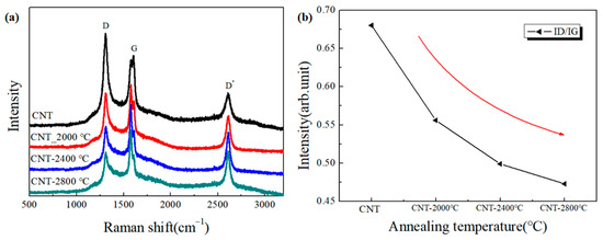 High temperature annealing can not only remove metal impurities but can also reduce defects in MWNTs. Raman spectra for the four samples of CNT, CNT-2000 °C, CNT-2400 °C and CNT-2800 °C were investigated, as shown in Figure 3a. The strong peak near 1580 cm−1 corresponds to the G-peak, which is used to reflect the degree of graphitization of the carbon nanotubes, and the strong peak near 1350 cm−1 corresponds to the D-peak which is used to reflect the disorderly fine graphite structure, i.e., the disorganization of the carbon nanotube structure. It is found that as the annealing temperature increases the D-peak gradually decreases, indicating an increase in the structural order of the MWNTs, while the G-peak gradually increases, indicating a better graphitization of the MWNTs and fewer defects. The ID/IG ratios calculated after extracting the areas of the D and G peaks are plotted in Figure 3b. The ID/IG values were 0.68, 0.556, 0.499 and 0.473 for CNT, CNT-2000 °C, CNT-2400 °C and CNT-2800 °C, respectively. It can be found that the ID/IG ratio decreases as the temperature increases, which means that the higher the graphitization of MWNTs, the lesser the defects, and this conclusion again confirms the previous XRD. Moreover, it is fully stated that high temperature annealing can not only remove metal impurities in MWNTs but also reduce their defects.