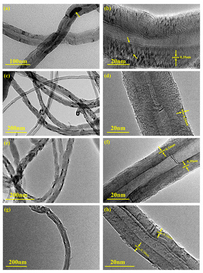 The TEM images of the CNT, CNT-2200 °C, CNT-2400 °C and CNT-2800 °C are shown in Figure 5a–d. The metal catalyst in the CNT sample is bounded with the MWNTs tube that is shown by arrows in Figure 5a. The walls of the MWNTs were bent and aligned irregularly, indicating great defects in the MWNTs at this point, which is shown by arrows in Figure 5b. However, the metal catalyst inside the MWNTs tube disappears while increasing the annealing temperature (shown in Figure 5c,e,g). The carbon atoms and the graphene layer on the walls of MWNTs were gradually ordered and became regular while increasing the annealing temperature, which revealed a great decrease in the defects of MWNTs (shown in Figure 5d,f,h). Notably, the planar spacing between both graphene layers within the MWNTs tubes was measured at 0.34–0.35 nm for the samples, which corresponds to the planar spacing value of multi-walled carbon nanotubes [30]. The TEM images mutually corroborate the ICP results presented previously in Figure 1.
