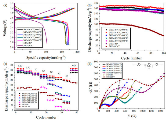 Electrochemical impedance spectroscopy (EIS) spectra of different batteries were investigated to understand the effect of different high-temperature-annealed MWNTs as a conducting agent on the performance of LiNi0.5Co0.2Mn0.3O2 cathode compared to SP. As shown in Figure 6d and Table 2, the inset is the equivalent circuit used for the simulation analysis of the EIS data, the Nyquist curves for all samples consist of a semicircle in the high- or mid-frequency region and a straight line in the low-frequency region. The intercept of the curve with the horizontal axis Z’ represents the ohmic resistance R1, which mainly represents the electrolyte, diaphragm and active substance of the cell; the arc in the mid-frequency region corresponds to the charge transfer impedance R2 on the surface of the active substance; the diagonal line in the low-frequency region corresponds to the Warburg impedance, which is the impedance caused by the diffusion of lithium ions in the active substance [32]. It can be seen that although the NCM-CNT (2000 °C), NCM-CNT (2200°C), NCM-CNT (2400 °C), NCM-CNT (2600 °C), NCM-CNT (2800 °C), NCM-SP and NCM-CNT batteries employ the same cathode electrolyte, they display different the SEI film impedance and charge transfer impedance. Among them, the NCM-CNT (2200 °C) battery presents the lowest SEI film impedance and charge transfer impedance, indicating that the lithium ion migration rate is highest at this point and the battery has lower internal consumption and better conductivity. However, the SEI film impedance and charge transfer impedance of the NCM-CNT (2000 °C) battery is similar to that of NCM-CNT (2400 °C) battery, but both of them are larger than that of NCM-CNT (2200 °C) battery. In addition, the sum of SEI film impedance and charge transfer impedance was greatest for the NCM-CNT batteries. The results corresponds well to cycle and rate behaviors, which indicates that the NCM-CNT (2200 °C) sample had the best electrical conductivity.