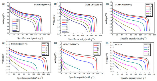In order to investigate the effect of MWNTs (slurry) conductive agent annealed at different temperatures on the performance of LiNi0.5Co0.2Mn0.3O2 cathodes, the initial discharge curves of different batteries at different current rates (0.2 C, 0.5 C, 1 C, 2 C, 3 C, 4 C, 5 C) were analyzed, as shown in Figure 7a–f. It can be seen that the discharge voltage plateau and discharge capacity gradually decrease as the discharge rate increases. This is due to the higher current rate which polarizes the cell and prevents the migration of lithium ions, thus reducing the conductivity of the cathode. Comparing the changes in the discharge capacity of the six batteries, the NCM-CNT (2200 °C) battery had the highest initial discharge capacity at all current rates, and its discharge plateau was stable with no distortion in the discharge curve. In contrast, the discharge curve of the NCM-CNT (2000 °C) battery is stable but its discharge capacity at different rates is lower than that of NCM-CNT (2200 °C) battery, probably because there are still more metal impurities in MWNTs, leading to higher internal consumption of the battery, while the discharge curves of NCM-CNT (2400 °C), NCM-CNT (2600 °C), NCM-CNT (2800 °C) and NCM-SP batteries showed distorted and unstable discharge curves at high current rates, and the discharge capacity also decreased substantially.