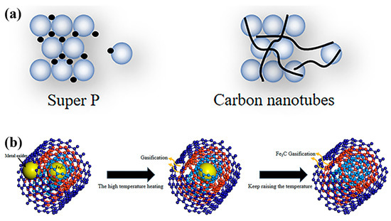 (a) Schematic diagram of Super P, CNTs and positive particles connection; (b) Schematic diagram of the mechanism of high-temperature purification of carbon nanotubes.