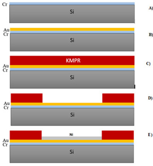 Microfabrication process: (A) Sputtering of Cr; (B) Sputtering of Au; (C) KMPR lithography; (D) UV-exposure (patterning); (E) Nickel pulse-reverse electroplating.