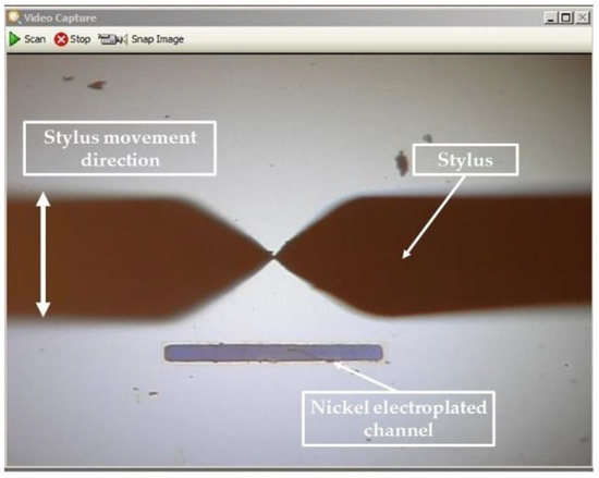 A contact profilometer (AlphaStep® D-100 stylus profiler, Milpitas, CA, USA) examined the surface roughness and thickness of the nickel layer. In this way, the specimen is placed on the stage of the profilometer after stripping the photoresist. As shown in Figure 3, a stylus in a typical contact position moves laterally from the starting point of the substrate along the width of the electroplated nickel channel for a certain distance and records changes in the height of the stylus. As a result, the thickness of the nickel layer can be measured by measuring the height changes between the substrate and the nickel surface. Furthermore, the arithmetical mean deviation of the profile (Ra) is calculated as the surface roughness on the nickel layer’s top surface (Figure 4).
