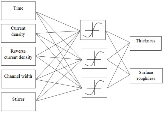 Artificial Neural Networks (ANN) is a simple, robust, nonlinear modeling tool that can predict and generalize experimental tests, for example, optimizing copper electroforming process parameters [23]. It uses many connections between its processing blocks as neurons. Neurons’ act is based on training patterns, inputs, and forecasting outputs. So to characterize the surface roughness and thickness of the nickel layer based on experimental results, the neural network box of MATLAB® V.2020a was used.