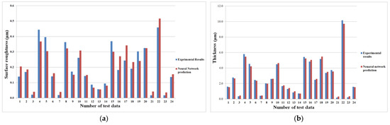 Figure 6a compares the results of ANN prediction and the actual results of the 24 check data sets. It can be concluded that the obtained surface roughness results of the experiments can verify the neural network prediction. Similarly, Figure 6b shows the high accuracy of the neural network in predicting the thickness of the nickel layer and can model the effect of the pulse-reverse electroplating process input parameters on the deposition rate and surface roughness.
