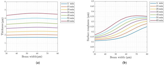 The resulting layer thickness, surface roughness, and beam width relation were plotted in Figure 7. Regarding Figure 7a, it can be observed that the thickness growth rate is linear and roughly constant with a change in beam width in the case of increased beam width. Nevertheless, it can be seen from Figure 7b that surface roughness grows with an increase in the beam width, and it should be considered in the design of wide beams. Notice that this concept rules for aspect ratios lower than 1, and for those higher than 1, it may be different [21].