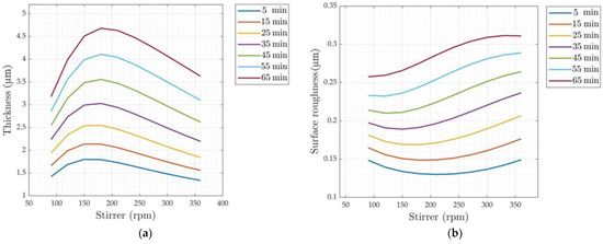 As Figure 8a shows, increasing the stirring speed will increase the overall layer’s thickness to an optimum, and then the thickness drops. Moreover, the optimum stirring speed rises slightly with increasing deposition time. Therefore, the optimal value in 5 and 65 min is 155 and 180 rpm, respectively, which shows the maximum nickel thickness relative to the stirring speed. The drop in the layer’s thickness when moving away from the optimum value is due to the increased speed of metallic ions, which prevents them from being attracted by the cathode [28]. Likewise, according to Figure 8b, the optimal value of the minimum surface roughness in the defined range for the stirring speed is observed. The optimal stirring speed for the best surface roughness decreases from 220 to 110 rpm for 5 to 65 min of deposition.
