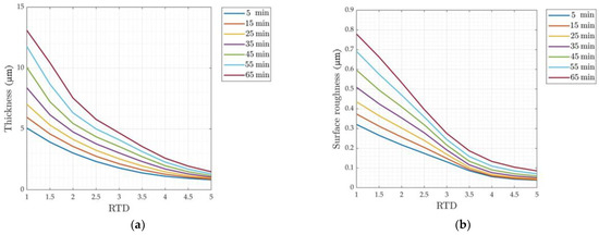 On the other hand, Figure 9b shows that the surface roughness improves when RTD increases. The ratio has a drastic effect on surface quality with a high ramp. Moreover, by increasing the deposition time, the changes are more severe related to the sum of the area under the current-time curve diagram. Increasing RTD would give the reverse circuit more opportunities to reduce surface roughness.
