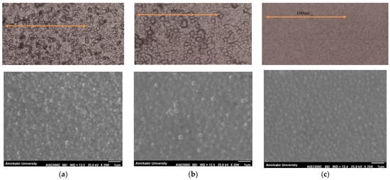 In another evaluation, Figure 10 shows optical and scanning electron microscope (SEM) images of three deposited nickel layers with a current density of 20 mA/cm2 and RTD of 2, 3, and 4. As stated in [29], the grain size increases when the RTD decreases. It is because increasing the reverse current density increases the time of the reverse current connected in the circuit. Therefore, it does not allow nickel grains to grow.