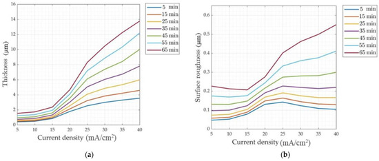 In addition, the results of surface roughness relative to current density are shown in Figure 11b. Behavioral change of surface roughness is similar to those in deposition rate. The surface roughness changes are negligible with increased current density from 5 to 15 mA/cm2. Increasing the current density from 15 to 25 mA/cm2 increases surface roughness. The surface roughness variation decreases in the current density greater than 25 mA/cm2.