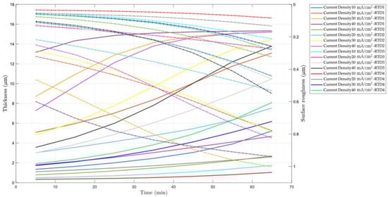 4D diagram of the relationship between current density, RTD, time versus thickness, and surface roughness of nickel at beam width: 50 μm and stirring speed: 180 rpm. (The dashed-dotted lines show the surface roughness value, and the solid lines show the thickness value).
