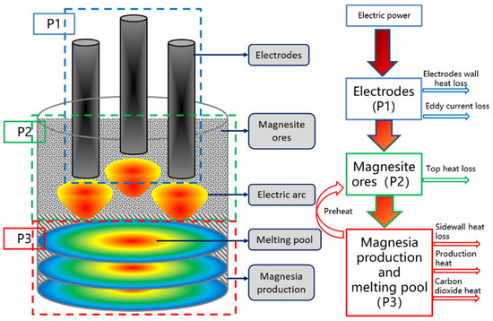 The main structure of the molten magnesium oxide furnace includes an electrode part (P1), an ore and arc part (P2), a molten pool, and a solidified billet part (P3). P1 mainly includes the electrode and electrode holder, P2 mainly includes the magnesite and excited arc, and P3 mainly consists of the molten magnesia and solidified magnesia products.