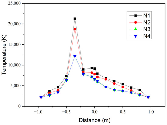 Figure 9a shows the temperature distribution at z = 0.65 m on the x-y section with different electrode insertion depths. It is obvious that, with an increase in the insertion depths from 0.4 m to 0.6 m, the maximum temperature increases from 8173 K to 13,120 K, the arc length increases from 0.048 m to 0.062 m, and the arc high-temperature diameter increases from 0.14 m to 0.16 m. In Figure 9b, the volume of the high-temperature area also increases slightly, but when the insertion depth is increased to 0.7 m, the maximum temperature decreases to 9723 K, and the range of the high-temperature area also decreases to 0.143 m, indicating that there must be an appropriate value for the electrode insertion depth to maximize the range of the arc area.