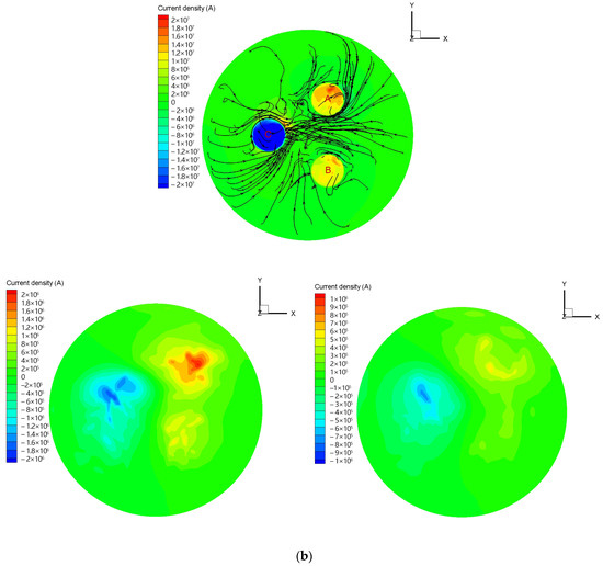 In order to understand the distribution of the current density, the longitudinal section of the arc region is used to represent the range of the high-current region of the arc, and the cross-section of the arc region is used to represent the current flow and phase distribution between different electrodes. Figure 6a shows the ranges of the arc regions, which are spherically distributed and connected below the electrodes. According to the basic principle of three-phase electricity, the current flow of the three-phase current changes at any time, the current can flow in or out of each electrode, and the current always flows from high potential to low potential. The results of the time captured in this paper are shown in Figure 6b. The current flows from A into B and C, forming a closed loop with the arc plasma as a conductor. Due to the skin effect of the alternating current, the current density outside the section is significantly higher than that inside the section.