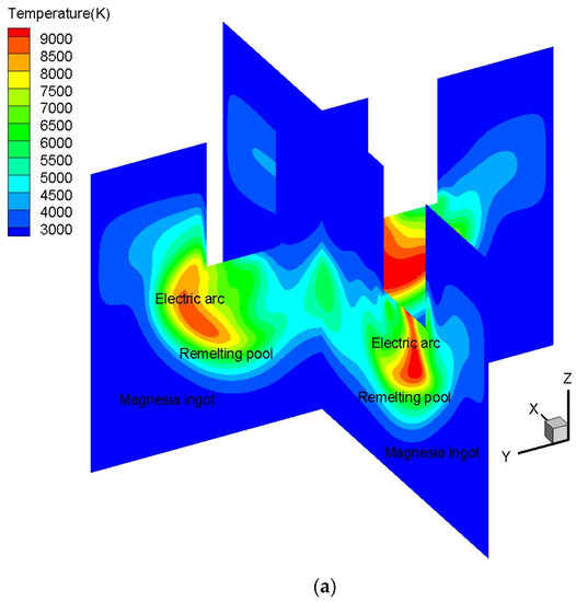 The temperature distribution in the arc area is shown in Figure 8a,b. The plasma part of the arc has the highest temperature and is in direct contact with the material, which provides the energy source for the decomposition and melting of magnesite. Influenced by the distribution of the current density and the rapid expansion of plasma, the high-temperature region forms a region with a high peripheral temperature and a low central temperature at the end of the three electrodes. The plasma regions of the three parts are connected to each other to form a closed loop, which provides a stable heat source for the smelting process. The maximum temperature in the inner arc zone is about 660 K, and the maximum temperature in the outer arc zone is 12,387 K. According to this phenomenon and production experience, it is reasonable to consider that the quality of the product outside the electrode may be higher than that in the center of the electrodes.