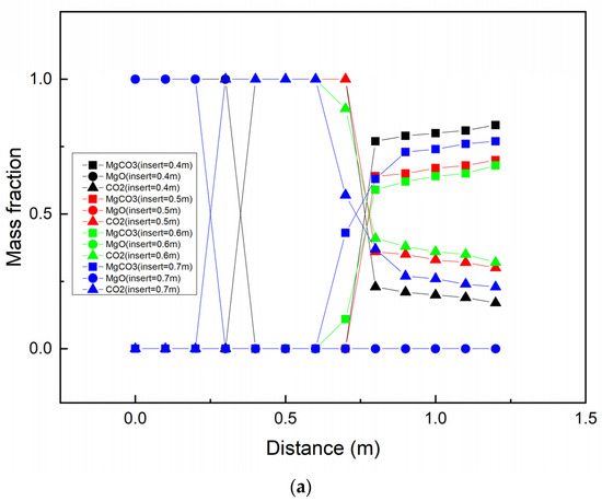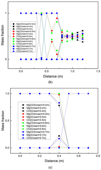 Figure 11a shows the longitudinal component distribution at Y = −0.65 M on the x-z section. The main component at 0–0.3 m is magnesia (A), the main component at 0.4–0.7 m is undecomposed ore (B), and the accumulated ore at 0.8–1.2 m is carbon dioxide (C) filled in the gap after partial decomposition. As the insertion depth is increased from 0.4 m to 0.6 m, the height of A increases from 0.3 m to 0.4 m, and the composition of block B changes from only magnesite ore to a mixture of undecomposed ore and magnesium oxide. With an increase in the insertion depth, the decomposition degree increases. The content of carbon dioxide in block C increases with an increase in the insertion depth. However, when the insertion depth is increased to 0.7 m, the promoting effect on decomposition declines.