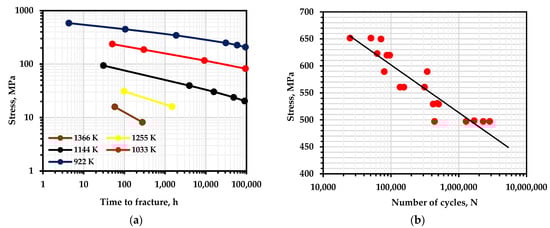 Durability curves: (a)—creep [44]; (b)—fatigue at 300 K [45] for nickel alloy 625+.