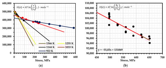 Therefore, in order to estimate the activation energy under complicated conditions (for example, during a “pole shift”), it is necessary to ensure the constancy of the structure in the studied range of temperatures and stresses [10,15]. The test results of the 08X18N9M2 and 12X18N12T steel samples showed this dependence [16]. The temperature–force coefficient for the activation energy was also proposed in [17].