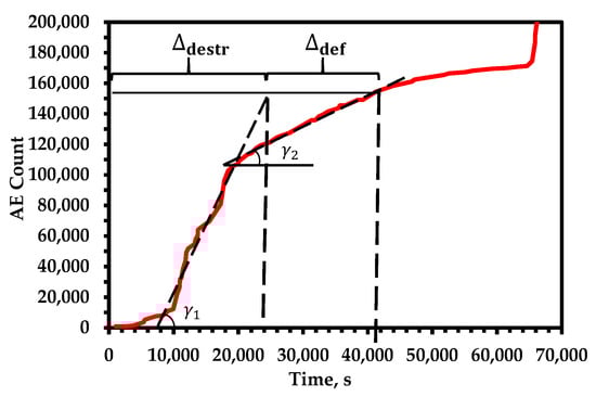 The multilevel model is based on recording reference structural elements’ (grains, fibers, etc.) times of destruction during loading. For this purpose, a stage of homogeneous destruction is allocated, at which the probability of destruction of such elements is equally likely and there is a kinetic feature common to such elements, namely, the angle of inclination of the logarithm curve of the total AE count.
