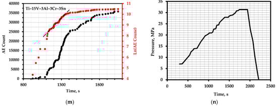 The total AE count and the logarithm of the total AE count over time: (a) nickel alloy 625+; (c) tool steel D2 (sample E3); (e) AISI 304 steel with 24 h exposure; (g) AISI 1060 steel; (i) A572 steel of grade 50 with a deformation value of 0.072; (k) M250 steel with hidden defects; (m) vessels made of Ti–15V–3Al–3Cr–3Sn alloy; (b,d,f,h,j,l,n)—corresponding loading schedules.