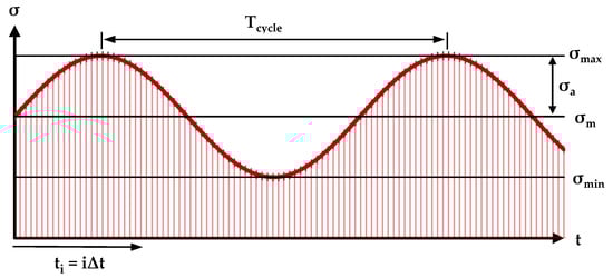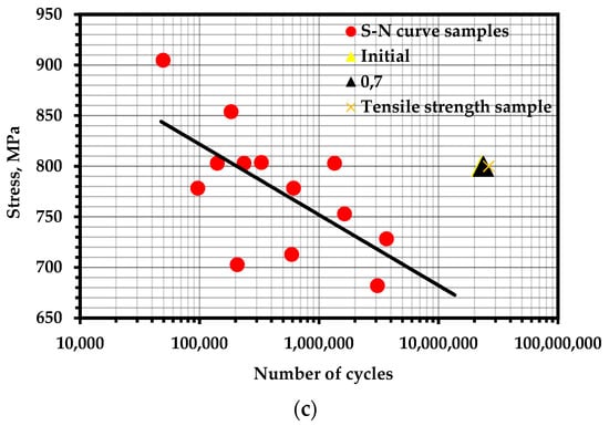 Fatigue curves of the corresponding alloys are used to estimate under cyclic loading (Figure 1b). Such a method of estimating (Figure 2b) can be simplified without analyzing the contribution of such phenomena as relaxation during loading cycles, temperature overheating, cycle shape, sinusoidal loading shape, and structural adjustments during prolonged loading, which were mentioned earlier, as follows: