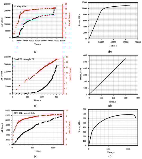 The total AE count and the logarithm of the total AE count over time: (a) nickel alloy 625+; (c) tool steel D2 (sample E3); (e) AISI 304 steel with 24 h exposure; (g) AISI 1060 steel; (i) A572 steel of grade 50 with a deformation value of 0.072; (k) M250 steel with hidden defects; (m) vessels made of Ti–15V–3Al–3Cr–3Sn alloy; (b,d,f,h,j,l,n)—corresponding loading schedules.
