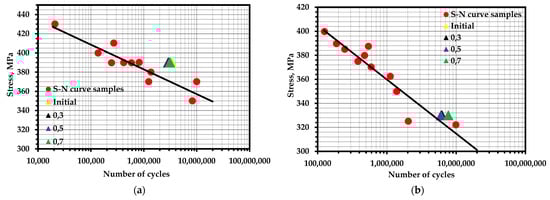 Fatigue curves of the corresponding alloys are used to estimate under cyclic loading (Figure 1b). Such a method of estimating (Figure 2b) can be simplified without analyzing the contribution of such phenomena as relaxation during loading cycles, temperature overheating, cycle shape, sinusoidal loading shape, and structural adjustments during prolonged loading, which were mentioned earlier, as follows: