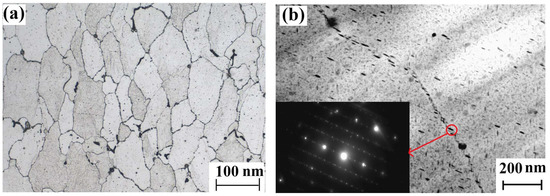 Samples were cut from the 7085-T7651 high-strength aluminum alloy ingot and polished using silicon carbide grinding papers from 180 to 2000 grit. Microstructures were analyzed using an optical microscope (OM, equipment model: Leica DMI5000M, Leica, Wetzlar, Germany) and transmission electron microscope (TEM: equipment model: JEM-2100, JEOL, Tokyo Japan). The metallographic structure of the 7085-T7651 high-strength aluminum alloy was α (Al) + dispersed phase + compound phase. The grain size of the 7085-T7651 high-strength aluminum alloy was relatively uniform with a grade of 5.0. The compound phase wasMgZn2, which precipitated along the grain boundary, as shown in Figure 1.