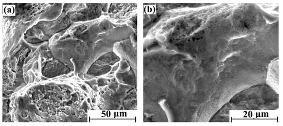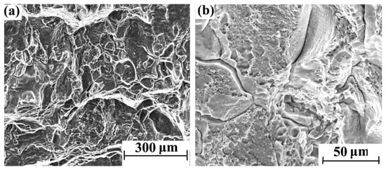Tensile fracture morphology of hydrogen-charged sample for 10 days: (a) 2000× and (b) 4000×.