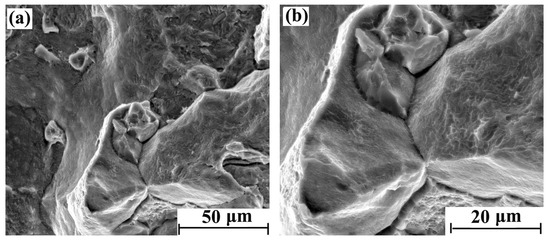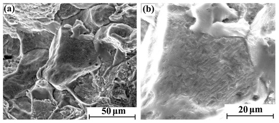 With the increase of hydrogen content, the fracture brittleness is gradually enhanced. The tensile fracture morphology with different regions after 5 days of hydrogen charging is shown in Figure 4a,b. There were obvious intergranular fracture characteristics in some areas of the cross-section, but the main morphological characteristics are still parabolic dimples. The tensile fracture morphology with different regions after 10 days of hydrogen charging is shown in Figure 5a,b. Compared with the sample with 5 days hydrogen charging, the intergranular fracture area is significantly increased. Furthermore, the parabolic dimples of the crystal plane are reduced, and the dimple openings are smooth. Therefore, the shape of the dimple is slightly inconspicuous. The tensile fracture morphology with different regions after 20 days of hydrogen charging is shown in Figure 6a,b, where there are more intergranular fracture areas on the entire cross-section. After the crystal plane enlargement, no obvious parabolic dimple morphology is observed, and a brittle ridge fracture is mainly observed.