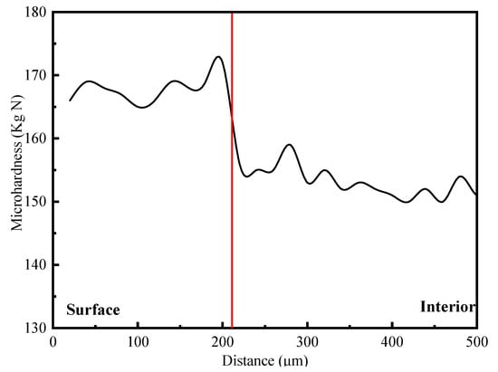 The microhardness gradient of hydrogen-filled samples was analyzed from surface to core. The result is shown in Figure 7. The microhardness of the hydrogen-charged sample changed significantly from the surface to the core, and the hardness turning point was at about 210 μm from the surface. Therefore, charging hydrogen in a 7085-T7651 high-strength aluminum alloy at a current density of 2 mA/cm2 for 20 days could make the penetration depth of hydrogen approximately 210 μm, and the surface hardness of the hydrogen-permeable area significantly increased.