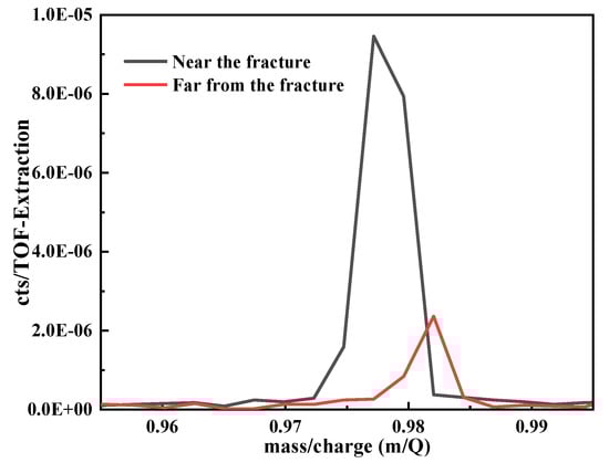 The intuitive and quantitative analyses of hydrogen were performed on tensile samples after pre-charge for 20 days by TOF-SIMS. The peak area was obtained by pseudo-Voigt fitting of the hydrogen peak positions in TOF-SIMS, which is proportional to the hydrogen content. Therefore, we can obtain the relative hydrogen content of different regions of the same sample under the same test conditions by calculating the hydrogen peak area. The test results of hydrogen near the fracture and far from the fracture were shown in Figure 8. The values near the fracture and far from the fracture are 0.000019 and 0.000003, respectively. It can be deduced that the content of hydrogen near the fracture is higher than that far from the fracture.