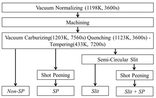 Slit + SP specimens were subjected to shot peening after introducing a slit, as shown in Figure 2. Table 2 shows the condition of the shot peening. The shot peening conditions applied in this study were typical conditions for carburized gears [13].
