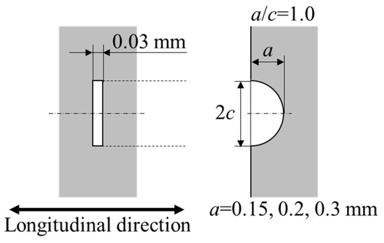 As an artificial surface defect, a semicircular slit was induced on the surface of the specimen by electric discharge machining to simulate an initial crack-like surface defect. Figure 4 depicts the shape and dimensions of the surface slit. The semicircular slit depths were 0.15, 0.20, and 0.30 mm.