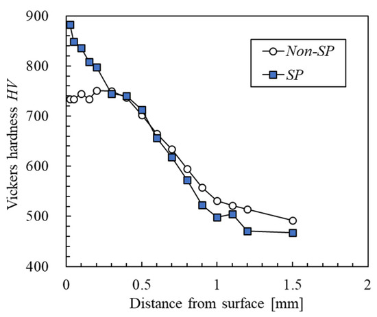 Figure 5 shows the distribution of the Vickers hardness. The surface hardness of the non-SP specimen was approximately 730 HV. The hardness near the surface was much higher than the base metal hardness of this material (approximately 400–500 HV). This increase in hardness was attributed to the formation of a large amount of martensite due to carburizing and quenching. The effective case depth was approximately 0.9 mm. The ratio of retained austenite on the surface of the non-SP specimen was approximately 13.1 vol.%. The ratio of retained austenite was defined as the volume ratio of austenite to martensite, as measured by X-ray diffraction. The hardness of the SP specimens increased to a depth of 0.2 mm by approximately 100 HV compared to the non-SP specimen. The volume of the retained austenite on the surface of the SP specimen was approximately 1.3 vol.%. The retained austenite content of the SP specimen was lower than that of the non-SP specimen. Tsuji et al. conducted shot peening on steels with different retained austenite [15]. As a result, hardness improvement by shot peening was obtained even in steels with low amounts of retained austenite. Therefore, the increase in hardness due to shot peening was caused by both work hardening and deformation-induced martensite. The hardness of the non-SP specimen at depths deeper than 1.0 mm was higher than that of the SP specimen. This was assumed to be due to the variation in the amount of carbon penetration by the carburizing treatment of the specimen.