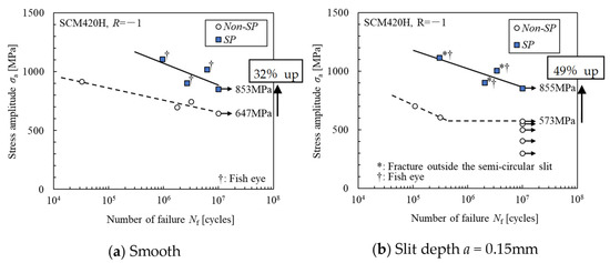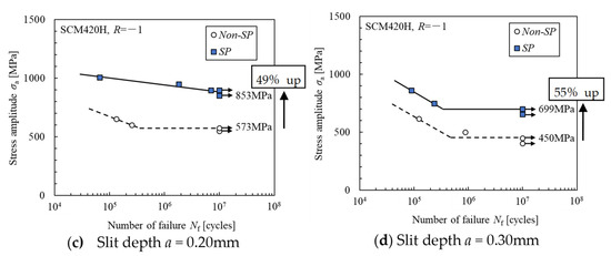 In the case of the slit depths of 0.15 mm and 0.20 mm shown in Figure 7b,c, the fatigue limit of the SP specimen was 49% higher than that of the non-SP specimen (573 MPa). Furthermore, these fatigue limits were equivalent to those of the smooth specimens with SP.