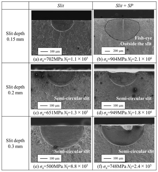 Figure 9 shows the fatigue fracture surface observation results of each slit specimen. Figure 9a shows the fracture surface of the 0.15 mm slit specimen fractured from the slit. On the other hand, slit + SP specimens with a slit depth of a = 0.15 mm, shown in Figure 9b, failed outside the slit. This fracture mode was a fisheye-type fracture. The elongated MnS was observed at fracture origin. The 0.20 mm and 0.30 mm non-SP specimens fractured from the slit, as shown in Figure 9c,e. Slit + SP specimens with slit depths of 0.20 and 0.30 mm shown in Figure 9d,f failed from the slit. The shape of the slit in the slit + SP specimen showed some deformation only near the surface as shown in Figure 9d,f. However, there is no change in the slit shape at the sub-surface. Thus, the effect of the deformation of the slit due to SP on the fatigue strength was small.