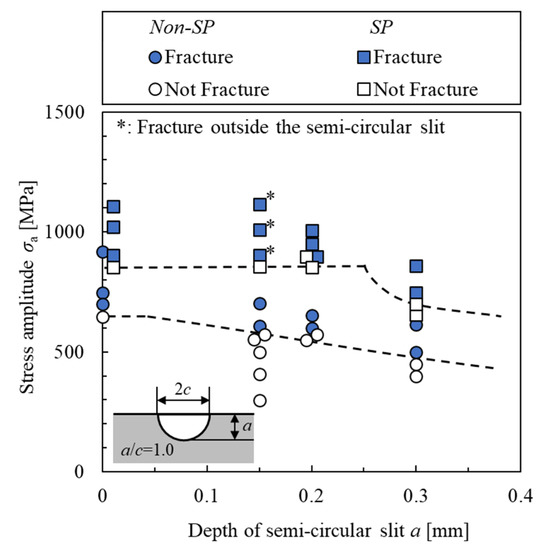 The fatigue limit of the non-SP specimen decreased with increasing slit depth. On the other hand, the fatigue limit of the slit + SP with slit depths a = 0.15 mm and 0.20 mm increased to 49% of the fatigue limit of the slit specimen, as shown in Figure 10. Therefore, a semicircular slit with a depth of at least 0.20 mm could be rendered harmless by shot peening.
