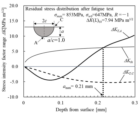 Figure 11 depicts the relationship between ΔKT of the semicircular slit and the depth of the SP specimen. ΔKT, A and ΔKT, c are ΔKT at the deepest point and the surface of a semicircular slit, respectively. The value of ΔKth depends on the crack size because the crack type targeted in this study is the so-called small crack. Many equations regarding the dependence of crack length were proposed in the literature [20,21]. Equation (4) reported by Ando et al. was employed to calculate ΔKth in this study [22].
