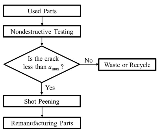 On the basis of the experimental and analytical results obtained in this study, we propose a remanufacturing process for carburized steel using shot peening, as shown in Figure 12. First, the cracks in the used parts were inspected by nondestructive testing, such as eddy current tests and ultrasonic testing. If the detected crack size is less than amax, shot peening is effective in rendering the defect harmless. However, the shot peening condition considered in this study is not effective for remanufacturing if the crack size of the used parts is larger than 0.2 mm. Note that amax is strongly dependent on the shot peening conditions. A future challenge for this process is to increase the amax.