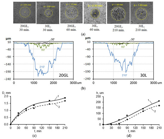 Figure 8e,f show the obtained kinetic curves of volume removal and corresponding curves of volume removal rate of examined steels 20 GL and 30 L respectively.