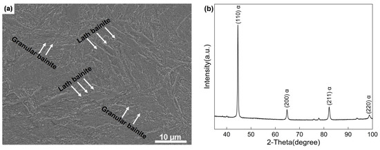 SA508 Gr.4N is a kind of Ni-Cr-Mo low carbon steel. The chemical composition of the test steel was obtained by the chemical analysis method, as shown in Table 1. Except for the low Si content in the test steel, the contents of other alloying elements are within the composition range of the specified ASME [22]. The original state of the experimental material is the forging annealing state. Its microstructure is shown in Figure 1a, and the X-ray diffraction diagram is shown in Figure 1b. Figure 1a shows that the microstructure of the original sample at room temperature is bainite, which is composed of granular bainite and lath bainite. Figure 1b shows the XRD results of the original sample; no precipitates, such as carbide, are detected.