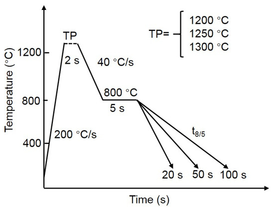 The physical simulation experiment of the welding heat-affected zone was carried out on the TA Instruments Dilatometer DIL805. The sample chamber is shown in Figure 2. The thermocouples were welded on the ϕ4 mm × 10 mm sample to monitor the sample temperature. During the experiment, the samples were heated by the induction coil and fixed with a push rod; meanwhile, the axial expansion of the samples was monitored during heating and cooling. In order to avoid the surface oxidation of samples at high temperature, the samples were, respectively, heated to 1200 °C, 1250 °C and 1300 °C at a heating rate of 200 °C/s after the sample chamber pressure was ≤0.04 Pa. The sample remained at the peak temperature only for 2 s. According to the actual welding process temperature variation, it is more practical to divide the cooling process into two parts. Therefore, in the peak temperature to 800 °C rapid cooling section, the rate of cooling was 40 °C/s, and stayed at 800 °C insulation for 5 s, according to different t8/5 time (20/50/100 s), to take different cooling rates to 50 °C. The experimental process is shown in Figure 3.